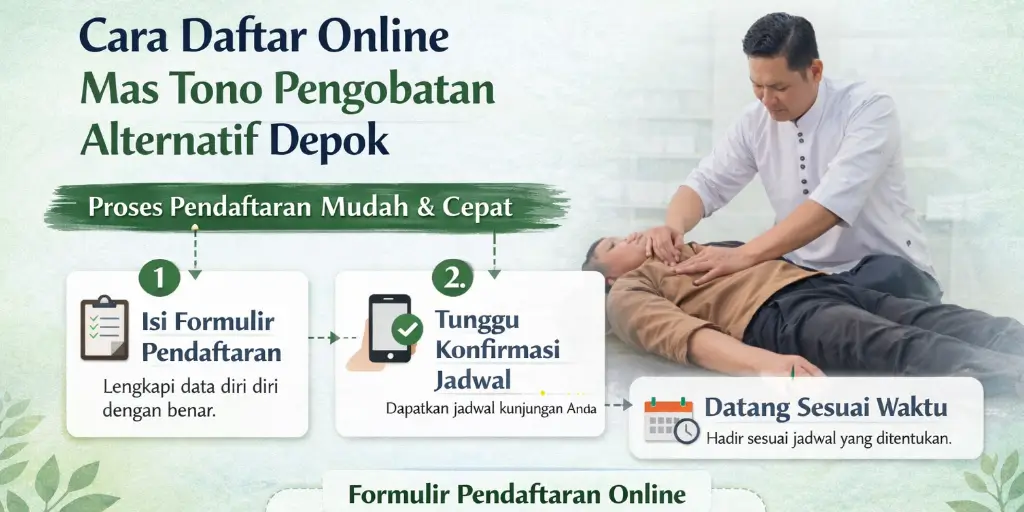 Untuk memberikan pelayanan yang lebih tertib dan nyaman, Mas Tono Pengobatan Alternatif Depok menerapkan sistem pendaftaran online. Sistem ini membantu mengatur jadwal kunjungan agar pasien tidak perlu menunggu lama di lokasi.
